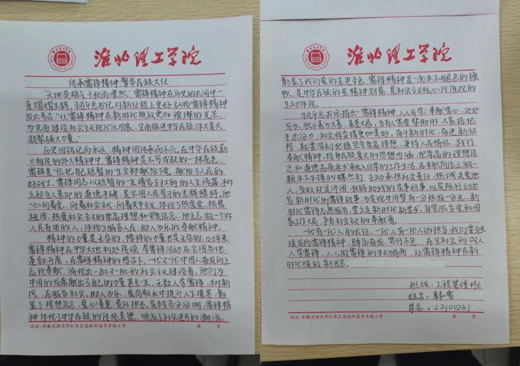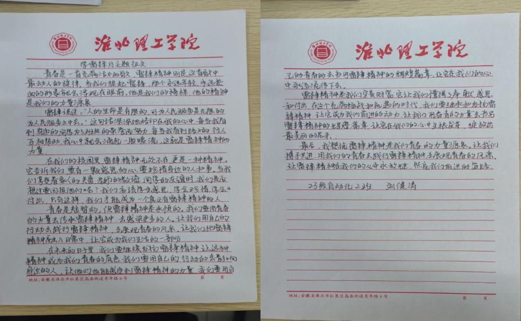 在此次征文活动中,学生们通过自己的笔触,讲述身边的雷锋故事,传递雷锋精神的价值内涵。他们的文字充满力量和温度,让人们感受到了雷锋精神的传承与发扬。2022级工程管理专业韩雪获得一等奖;2023级自动化二班刘健涛、2022级工程管理班魏欣如获得二等奖;2023级智能制造工程二班吴颜、2023级智能制造工程一班张雪桐、2023级工程管理班张真真获得三等奖。