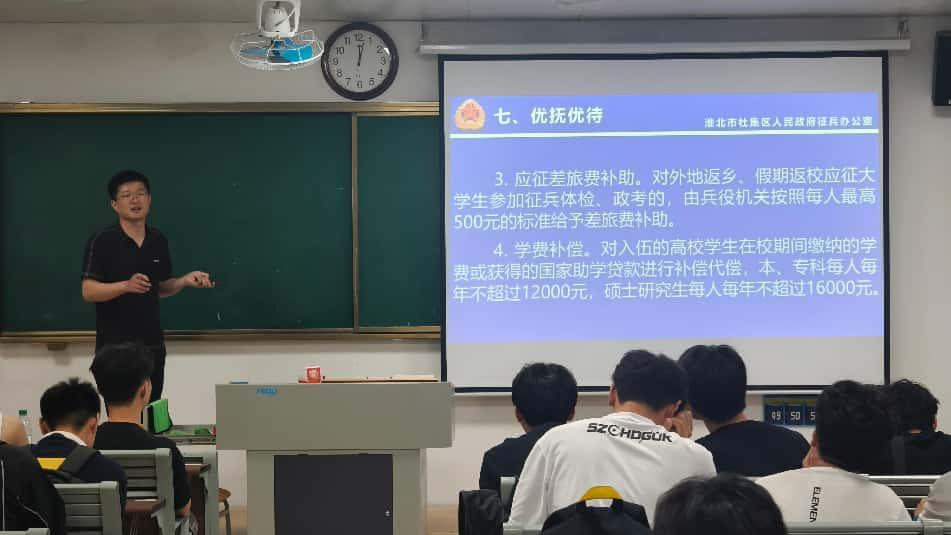 会上,辅导员围绕当前国家征兵政策、高校学生参军入伍的基本条件、优待政策、退役复学保障、职业发展前景等内容进行了系统讲解,并通过播放征兵宣传片、分享优秀退役复学生典型事迹,增强同学们对军旅生活的真实了解和认同感。现场气氛热烈,同学们认真聆听、积极提问,展现出浓厚兴趣和高度关注。