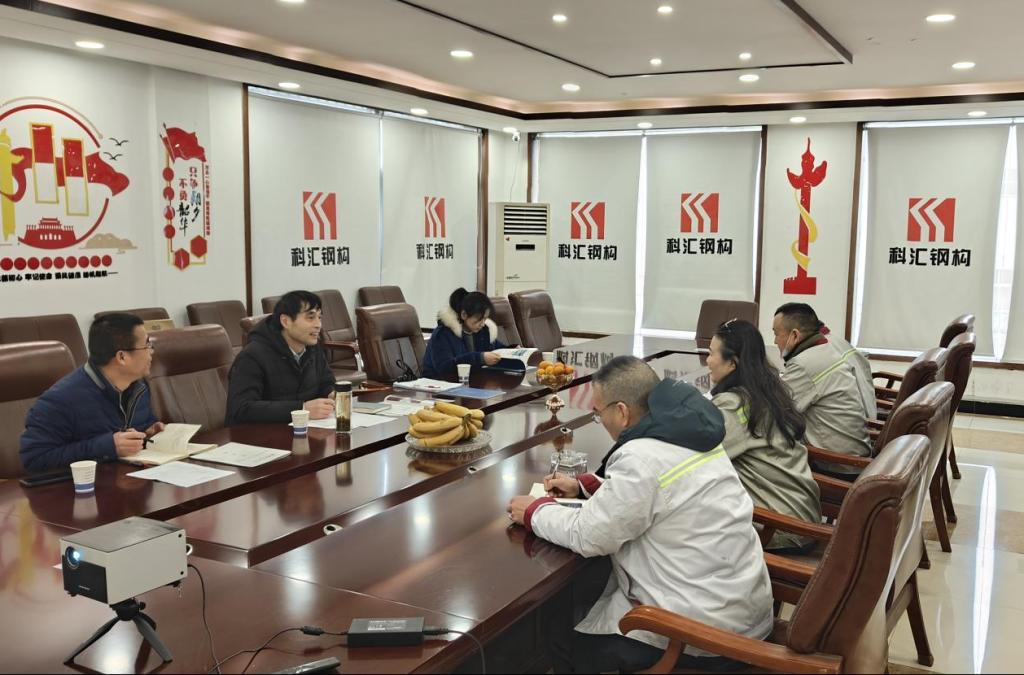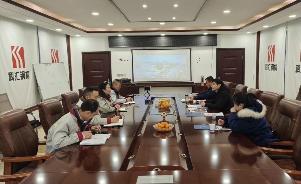 会议伊始,科汇钢构董事长杨波对张安宁院长、梁龙喜、孙冠晓、段代昭等一行4人的到来表示热烈地欢迎。杨董事长围绕企业发展规模、部门组成、人员力量、承揽业务范围、年度产值以及技术工艺应用研究等方面向到访人员做了详尽地介绍,并一同观看公司的宣传片。